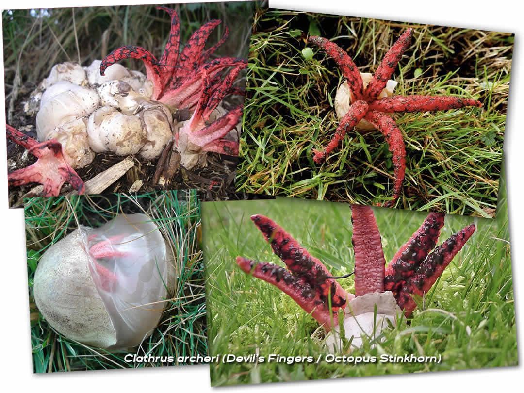This stinkhorn bursts from a white “egg” into a slimy, tentacled structure dripping with spore-laden goo. The foul smell of decaying meat lures flies.